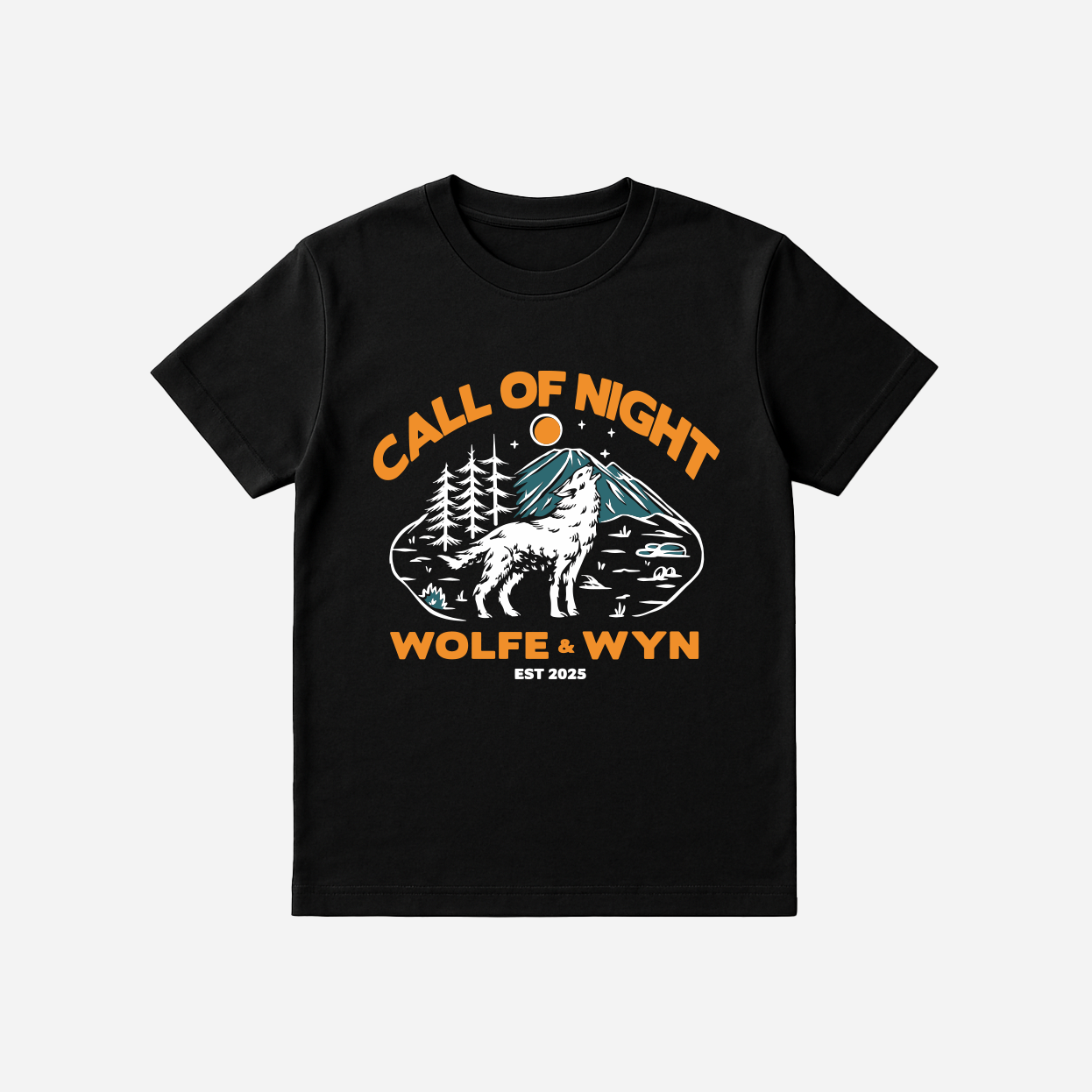 This graphic tee features a hand-drawn wolf howling amid pines, rocky mountains, and a burnt-orange moon, perfect for outdoor enthusiasts.