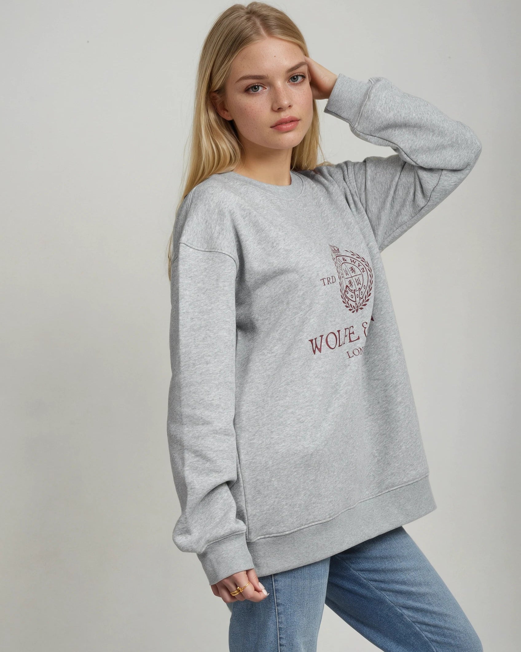 Timeless Wolfe & Wyn London crest in deep burgundy, crowned with laurel for a refined look. Clean, heritage graphic that elevates everyday fits.