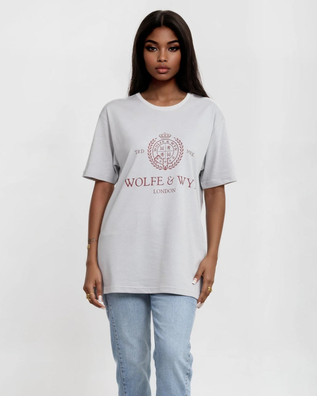 The Wolfe & Wyn crest, prominently displayed in deep burgundy, is surrounded by laurel and crown details, with subtle "TRD / MRK" cues.